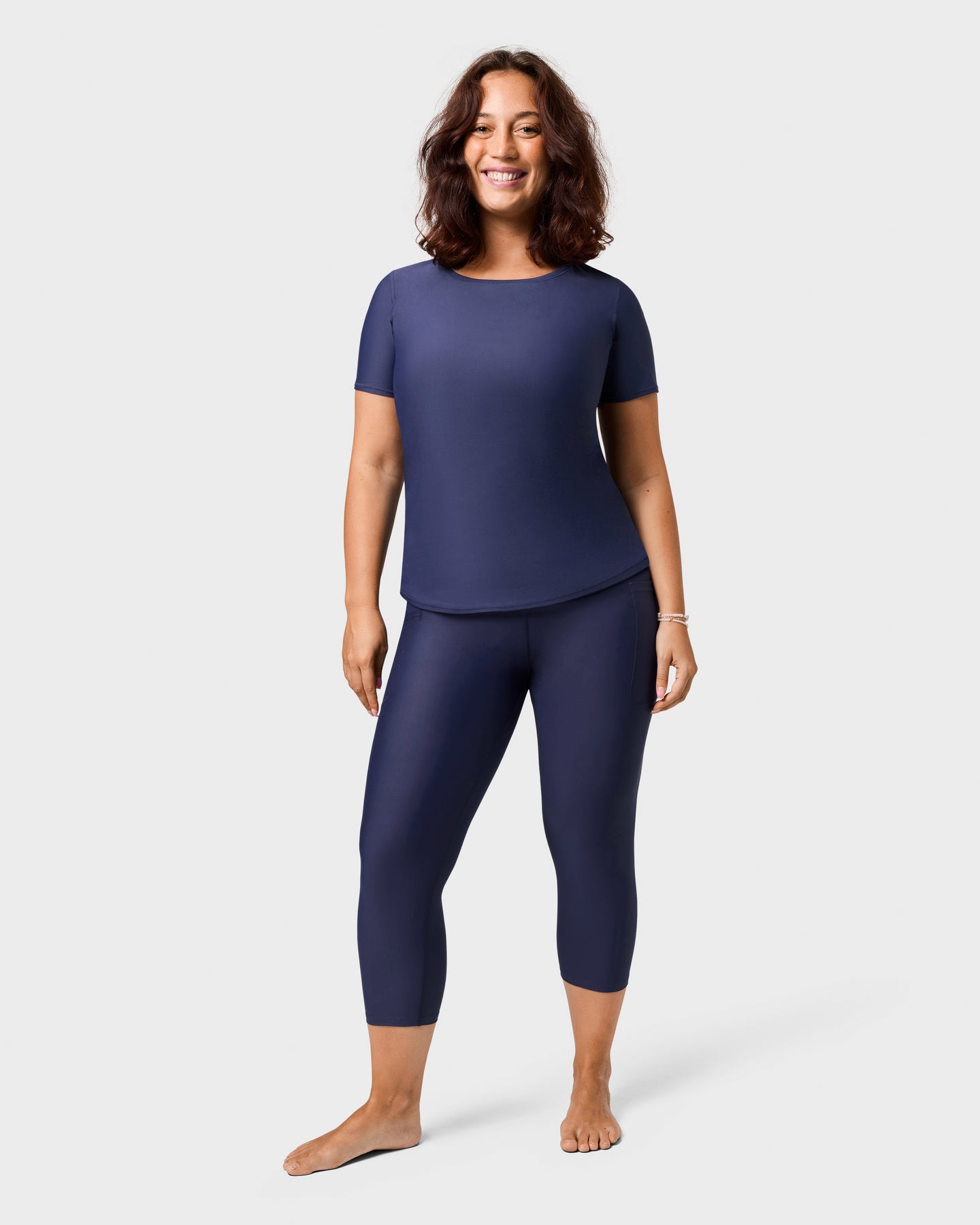 Capribukser er en kortere versjon av leggings, og passer derfor perfekt til vår og sommer. Våre korte tights har en bred, høy midje med en tynn strikk som sørger for at de holder seg på plass når du beveger deg. Det myke stoffet kan strekkes uten at det mister sin vakre farge, og både passform og mykhet bevares vask etter vask.