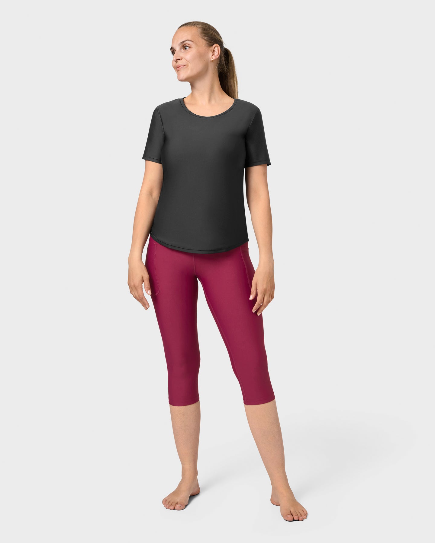 Capribukser er en kortere versjon av leggings, og passer derfor perfekt til vår og sommer. Våre korte tights har en bred, høy midje med en tynn strikk som sørger for at de holder seg på plass når du beveger deg. Det myke stoffet kan strekkes uten at det mister sin vakre farge, og både passform og mykhet bevares vask etter vask.