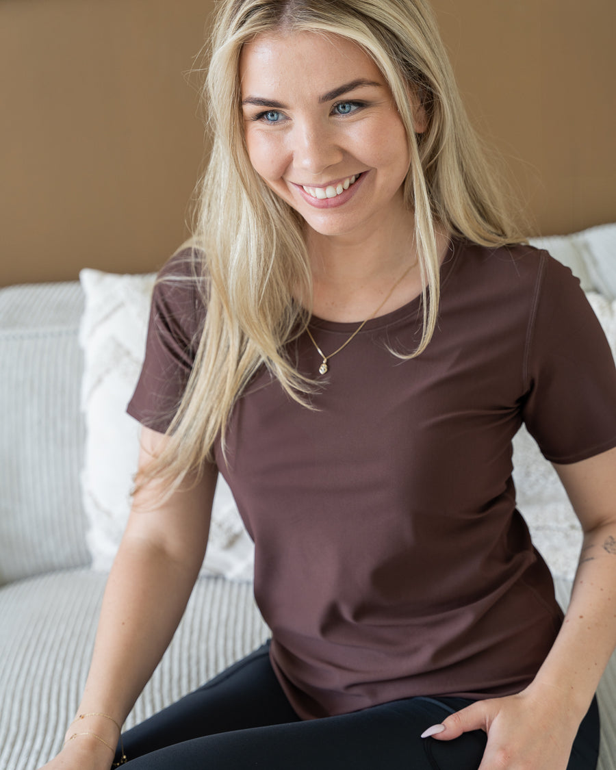 Vigga-T-skjorten er laget av et mykt, lett og elastisk materiale som følger kroppens bevegelser og gir en vakker, skreddersydd passform. Stoffet føles behagelig mot huden og gir deg full frihet hele dagen.
